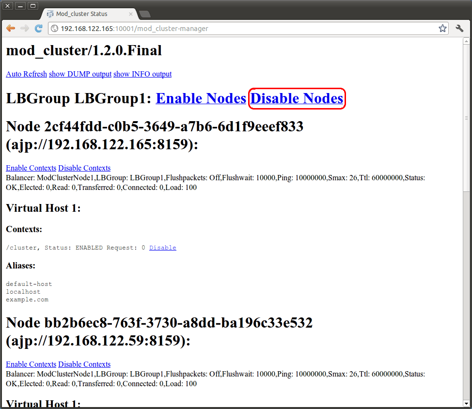 When scaling the cluster down you will need to take care of existing sessions. That is why you can not just kill all the servers of that sub-cluster. The first step is to ensure that the sub-cluster(s) we want to take down will not get any fresh sessions. When using mod_cluster this is pretty simple: There are various disable-buttons. The big marked “Disable Nodes”-button of the screenshot below is the right one. If you click that button mod_cluster will not direct new sessions into our sub-cluster anymore. But existing sessions will still be processed in our sub-cluster. Now you will need to wait until all these sessions vanish. Then you can stop the servers via cli or web-console. The existing but unused server-group does not hurt anybody and can maybe get reused when you scale the cluster up later, but you can also delete them.