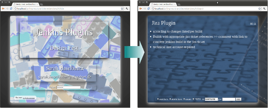 Open your web browser, type http://localhost/pr/impress-js-articles-extensions in the address bar, and press Enter. Boom! You now have the template project up and running. Why do you see Jenkins Plugins as the title? Well, that’s the use case on which we first applied the Threshold Voting Workshop concept.